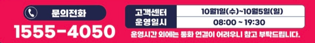 - 고객센터 운영 시간: 10월 1일(수) ~ 10월 5일(일) 08:00 ~ 19:30