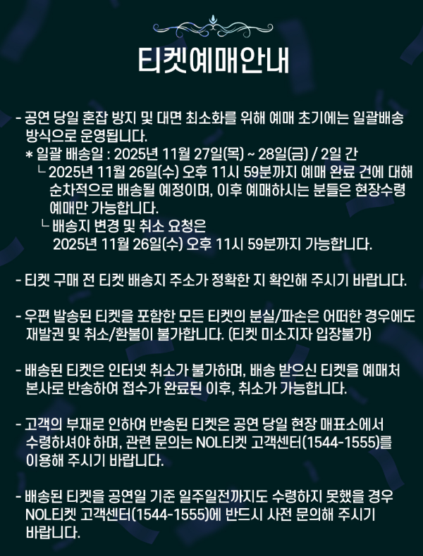 이번 공연은 NOL 티켓 단독 판매로 진행됩니다. 예매 시작 최소 30분 전에는 사이트에 로그인하고, 결제 수단(간편 결제, 카드 정보 등)을 미리 등록하여 결제 과정에서 발생하는 시간을 최소화해야 합니다.