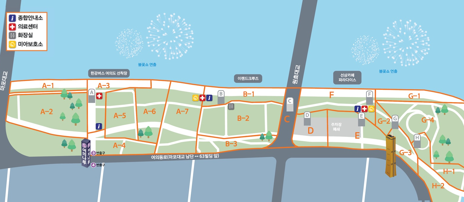 A. 불꽃축제 당일 차량 진입이 어렵습니다. 대중교통 이용이 안전합니다.