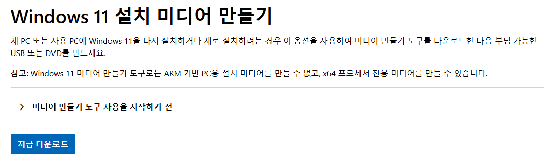 - 도구 다운로드: 마이크로소프트 공식 홈페이지의 '윈도우11 설치 미디어 만들기' 섹션에서 '지금 다운로드' 버튼을 클릭합니다. (최신 버전을 다운로드하세요.)