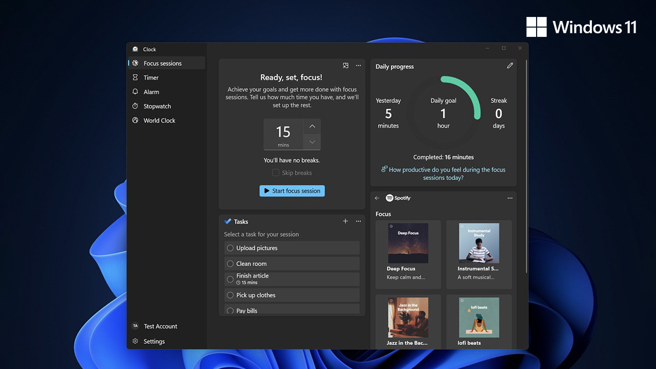 일정 시간 동안 알림을 차단하고 작업에만 집중하도록 도와주는 기능입니다. 생산성 앱인 '시계'와 연동되어 타이머를 설정하고, 음악까지 들으면서 몰입할 수 있습니다. '짧은 시간 안에 끝내야 하는 업무'를 처리할 때 최고의 효율을 보여줍니다.