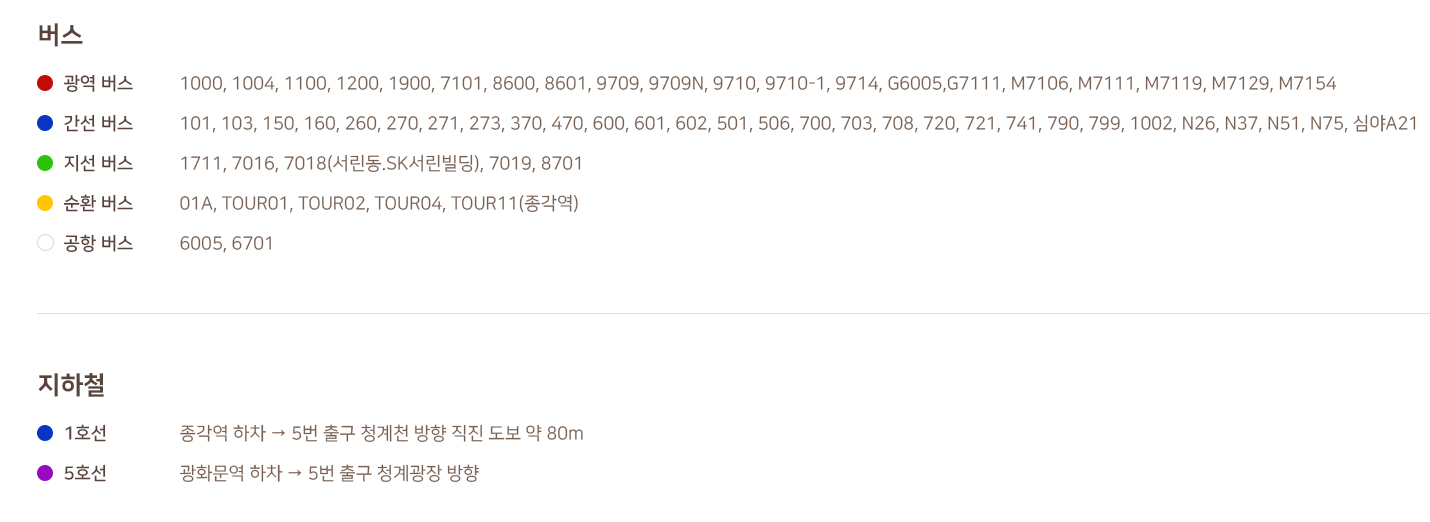 - 1호선 종각역: 5번 출구 (청계천 도보 3분)